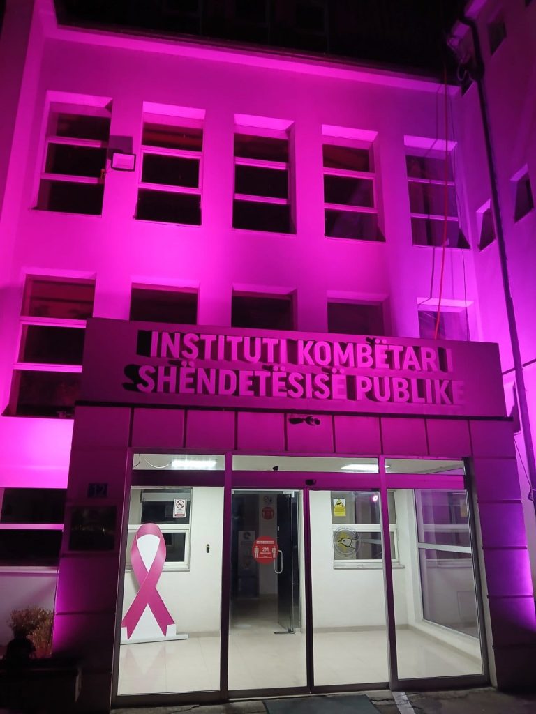 Instituti Kombëtar i Shëndetësisë Publike është ndriçuar me ngjyrë rozë për të shënuar muajin e ndërgjegjësimit ndaj kancerit të gjirit. Ngjyra rozë simbolizon shpresën, solidaritetin dhe mbështetjen për të gjitha gratë që përballen me këtë sëmundje, si dhe kujton rëndësinë e kontrollit të hershëm dhe parandalimit. Me ty fillon parandalimi!